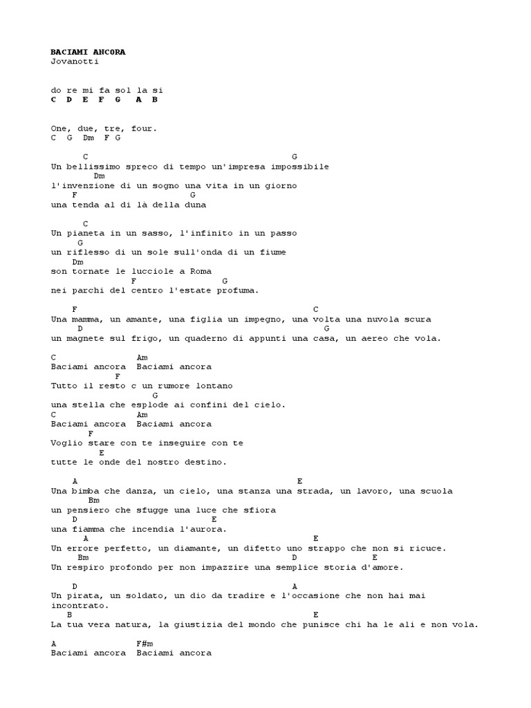 Baciami Ancora Accordi - Jovanotti - Gcon i nostri riflessi migliori.. Medusa film, fandango in collaborazione con mediaset premium e rds. ritornello baciami ancora baciami ancora tutto il resto un rumore lontano una stella che esplode ai confini del cielo baciami ancora baciami ancora voglio stare con te inseguire con te tutte le onde. Translation of 'baciami ancora' by jovanotti from italian to english. Gcon i nostri riflessi migliori. 2010 | sentimentaledisponibile fino al 24/01/2021.